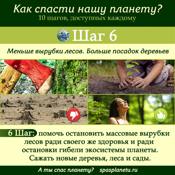 6-й шаг: помочь остановить массовые вырубки лесов ради своего же здоровья и ради остановки гибели экосистемы планеты. Участвовать в посадке новых деревьев, лесов и садов.