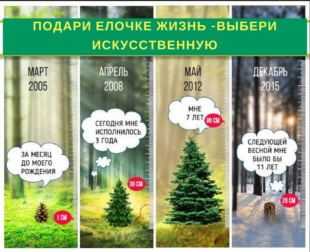 5. В преддверии Нового года во всём мире открываются миллионы ёлочных базаров. Никто не осмеливается назвать цифру и оценить объёмы торговли, потому что в каждом населённом пункте ради нескольких дней праздников наносится непоправимый ущерб природе. Каждый год на новый год вырубают миллионы елей! А ведь для того, чтобы вырастить ель, требуется не менее 10 лет. Каждый может посчитать: сколько лет он ставил у себя дома ёлку? 40-50 лет? У многих получится целый парк срубленных и погубленных деревьев.