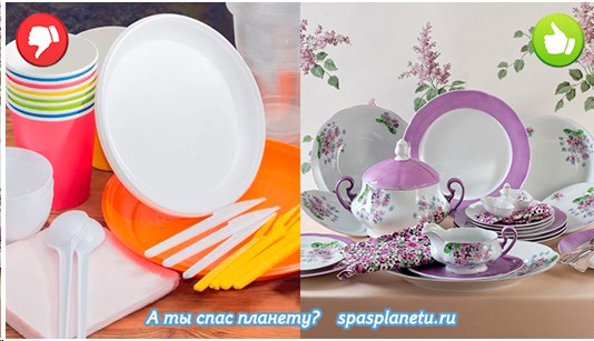Если одноразовая посуда всё же необходима, то можно использовать биоразлагаемую посуду - экологически чистую альтернативу пластмассовым тарелкам, стаканчикам, ложкам, вилкам и т.д.